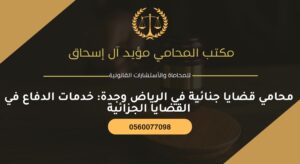 أشهر محامي قضايا جنائية في السعودية وكيف تختار محامي دفاع قوي يعد محامي قضايا جنائية من أهم المتخصصين في المجال القانوني داخل المملكة العربية السعودية، حيث يلعب دورًا أساسيًا في الدفاع عن الأفراد المتهمين في القضايا الجنائية والجزائية أمام الجهات القضائية. فالقضايا الجنائية غالبًا ما تكون معقدة وحساسة، وقد تترتب عليها عقوبات قانونية مختلفة مثل السجن أو الغرامات أو غيرها من العقوبات التي ينص عليها النظام القضائي. لذلك فإن الاستعانة بـ أفضل محامي قضايا جنائية يمثل خطوة ضرورية للحصول على دفاع قانوني قوي. ويعمل محامي القضايا الجزائية في السعودية على تحليل الأدلة والوقائع بدقة وتقديم دفاع جنائي فعال أمام المحكمة من أجل حماية الحقوق القانونية وتحقيق العدالة.
