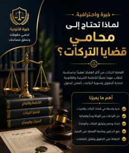 إن الاستعانة بـ محامي تركات لا تقتصر على حل النزاعات فقط، بل تشمل أيضًا تقديم الاستشارات القانونية، والإشراف على الإجراءات، والتأكد من تطبيق الأنظمة الشرعية بدقة. سواء كنت تواجه نزاعات الورثة أو ترغب في تقسيم التركة بشكل ودي، فإن وجود محامي متخصص في تقسيم التركات بين الورثة يمنحك راحة البال ويجنبك الكثير من المشاكل المستقبلية.
